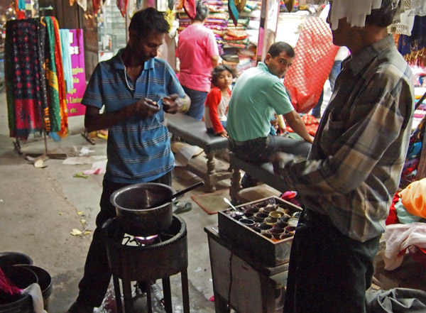 Ud fra farvekoncentrat kan denne unge fyr lave 60 forskellige farver – du siger bare hvilken farve du vil have dit tøklæde og han varmer farven i gryden og dypper tørklædet/ stoffet og du få straks et tørklæde i præcis den farve du drømmer om.