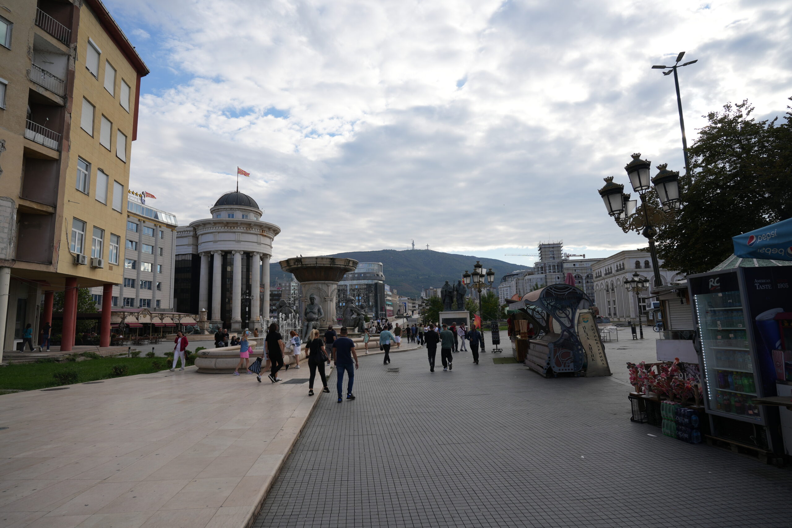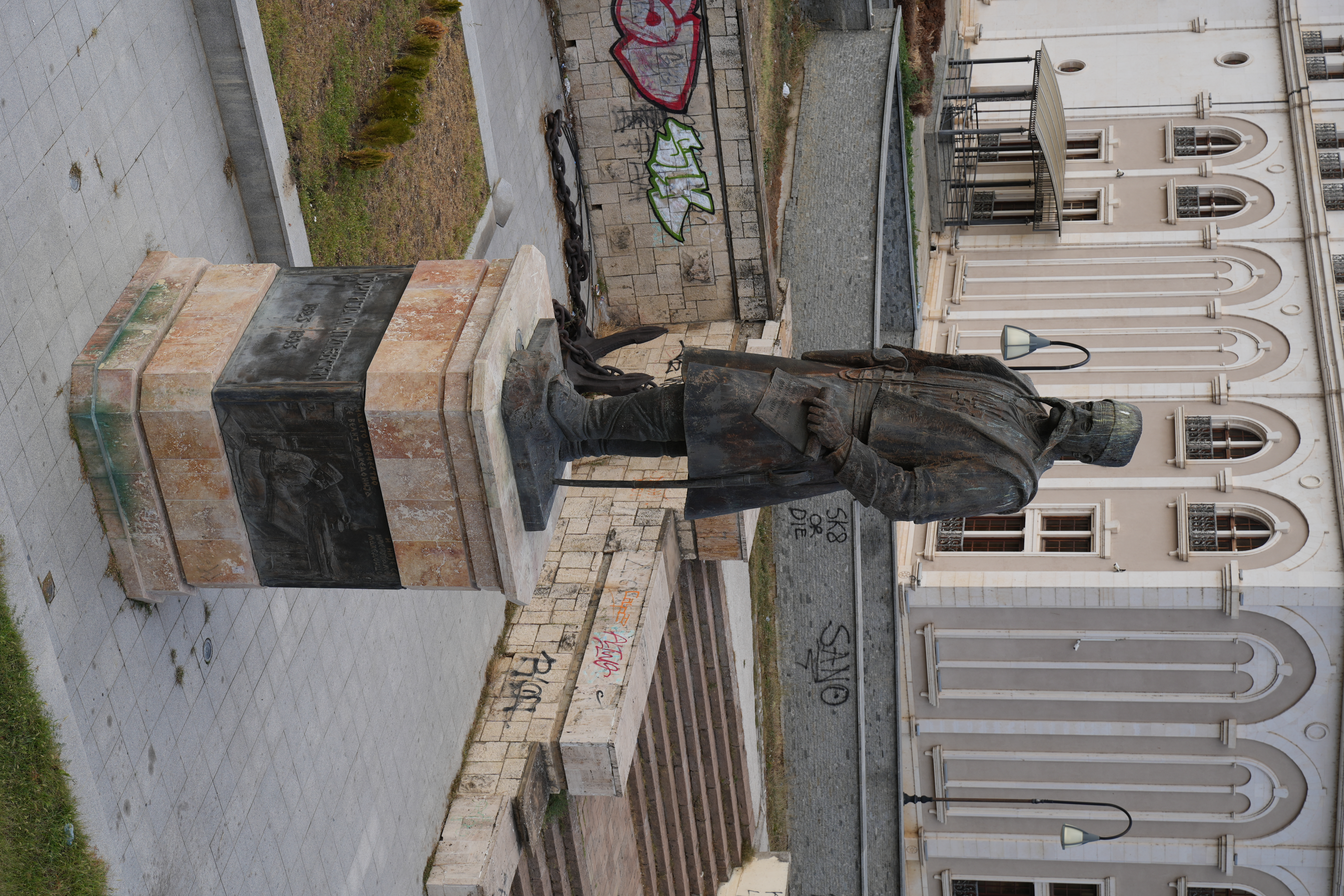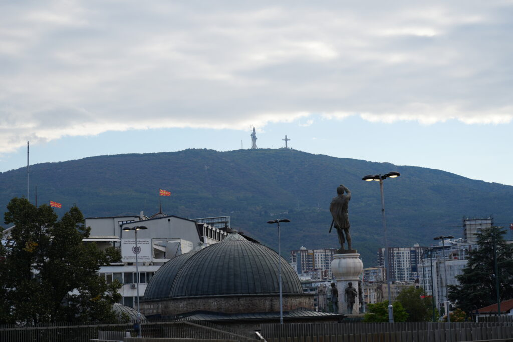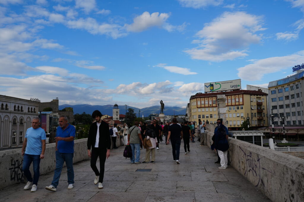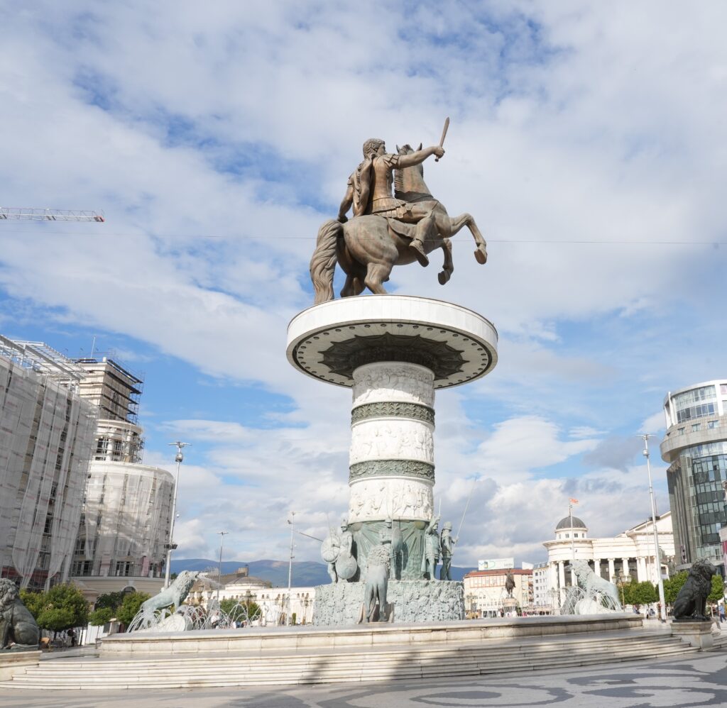 Skopje er plastret til med en masse kitschede statuer og monumenter i old-græsk stil. Den mest imposante er Alexander den store til hest på byens centrale torv – Macedonien Square – som ligger lige syd for floden Vardar og med adgang til nordsiden over ”Stenbroen”, en smuk bro som fører over floden Varder til nordsiden hvor vi finder ”Den gamle bazar” med masser af seværdigheder, spisesteder, moskeer. Og her finder man også museet for ”Den makedonske kamp for uafhængighed” og Skopje-fæstningen.